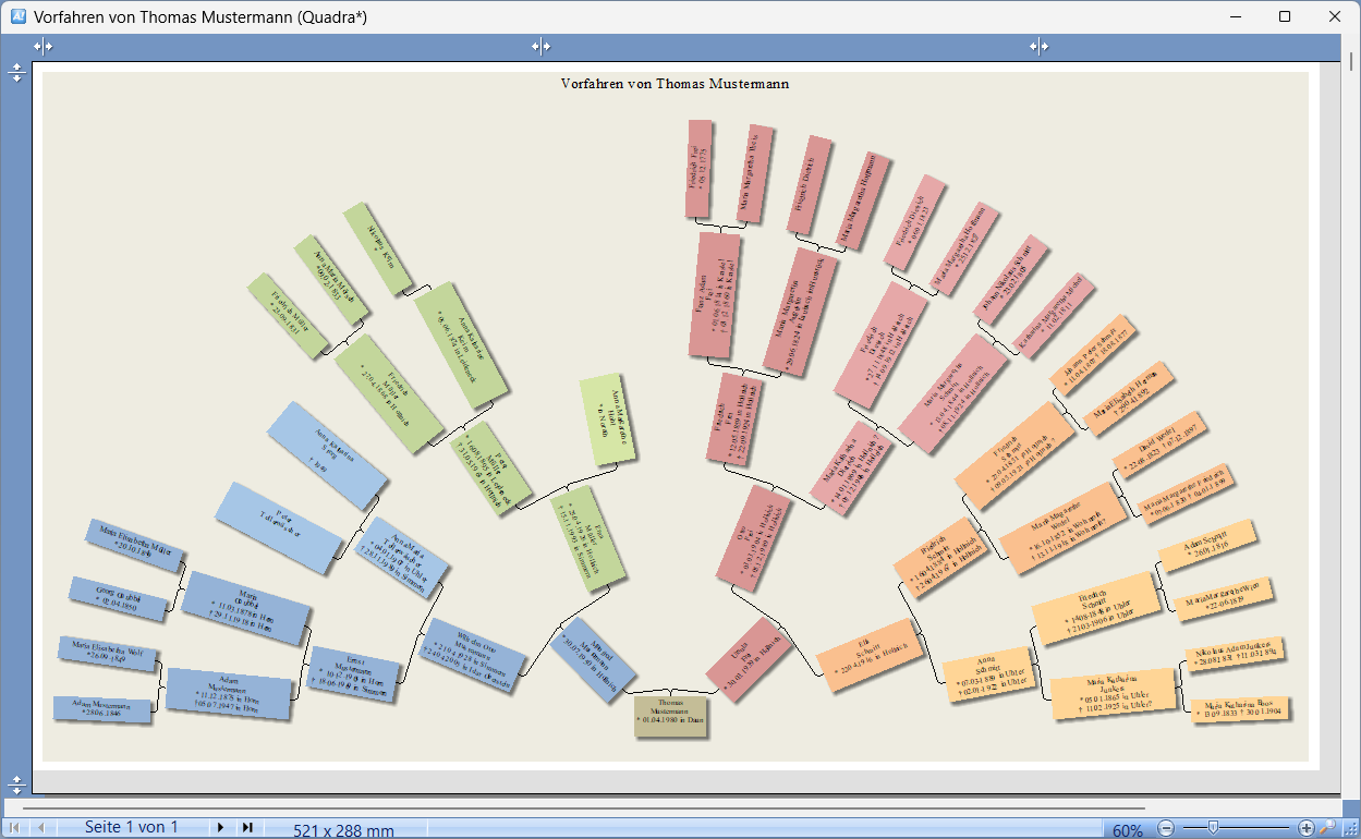 Jetzt geht’s rund – mit den neuen Fächerdiagrammen! Mit dem neuen Diagrammtyp „Fächerdiagramm“ können jetzt Vorfahrenbäume in Halbkreisformation erstellt werden. Besonders hübsch wird das zusammen mit dem neuen integrierten Layout „Quadra“, welches die vier Hauptabstammungslinien farblich hervorhebt.